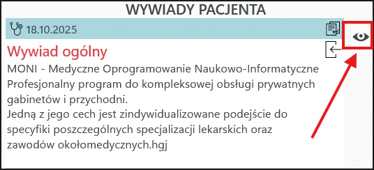 - Przy każdej wizycie w historii jest ikona „oka” – kliknij, aby podejrzeć cały wywiad z tej wizyty bez przechodzenia do jej edycji.