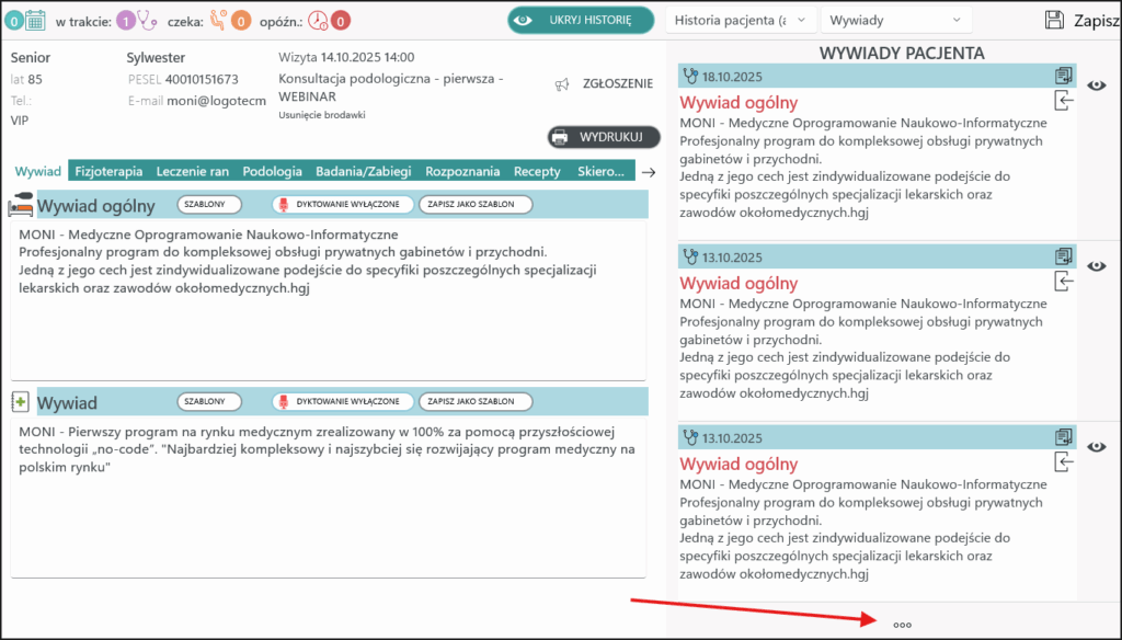 - Rozwiń listę (trzy kropki), aby szybko przeskrolować starsze wizyty bez opuszczania bieżącego wywiadu.