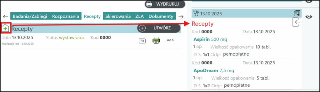 - Kliknij ikonę przy nagłówku danej sekcji, aby wyświetlić wszystkie wcześniejsze pozycje (np. wcześniejsze recepty pacjenta).
