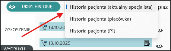 1) Historia pacjenta – aktualny specjalista (domyślnie)