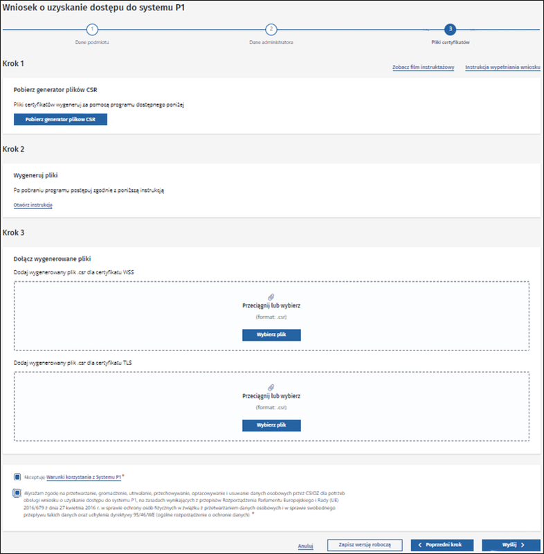 Wróć do formularza w RPWDL 2.0, dodaj pliki WSS.CSR i TLS.CSR, zaakceptuj zgody i kliknij Wyślij wniosek.